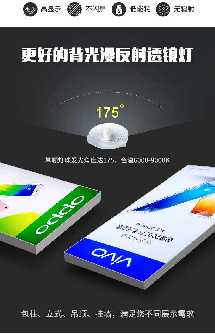 產品用途超薄節能燈箱主要適用范圍:廣告媒體、墻面裝飾宣傳、室內外指示牌……
